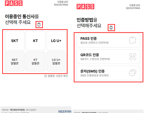7. 본인 인증을 위한 통신사 선택 : 본인이 사용하고 있는 “통신사” 및 “인증방법” 선택