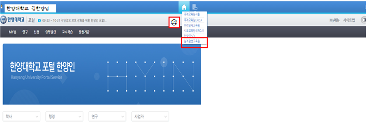 - 한양대학교 포털로 접속시 원격평생교육원 교내정보시스템으로 이동하여야 교내정보시스템에 정상적으로 접속 및 회원가입이 가능합니다.