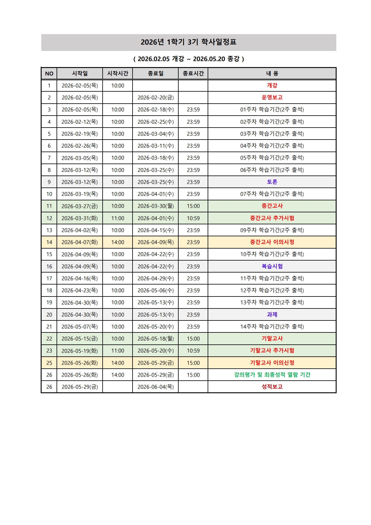 2026년 1-3기(2월 5일개강) 학사일정 안내
