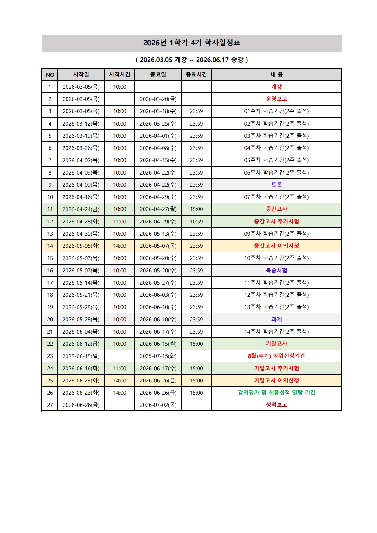 2026년 1-4기(3월 5일개강) 학사일정 안내